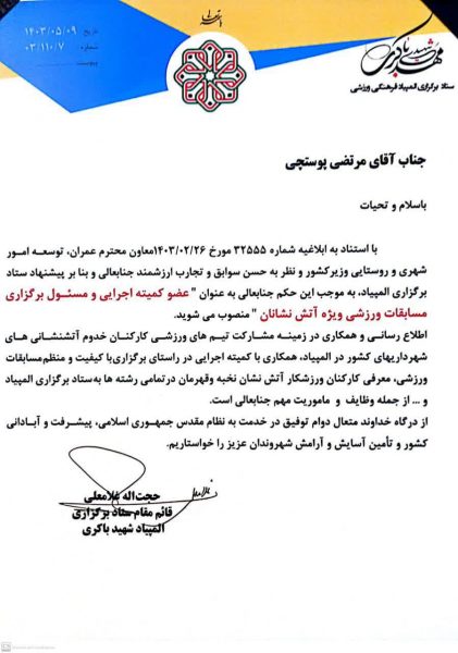 ازسوی معاون عمران،توسعه امورشهری و روستایی وزیر محترم کشور مرتضی پوستچی خراسانی نایب رییس فدراسیون جهانی ورزش های آتشنشانان جهان عضو کمیته اجرایی ومسئول برگزاری مسابقات ورزشی ویژه آتشنشانان کشور در حوزه شهرداریها منصوب گردید.
